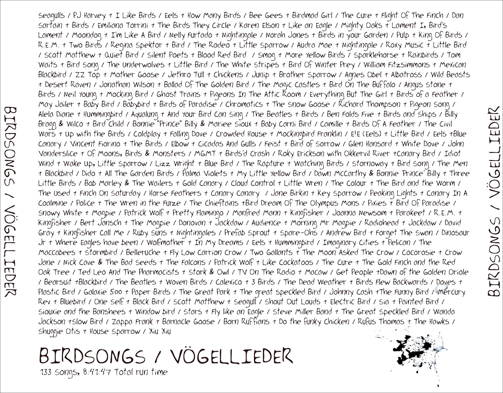 Aber es befinden sich viele weitere herausragende Künstler, wie z. B. The Cure, Roxy Music, Prefab Sprout, Tom Waits, Scott Matthew, Neil Young, Bonnie "Prince" Billy, The Beatles, Stornoway und und und auf der Playlist, die meine These untermauern. Es gibt natürlich noch viel mehr Lieder über Vögel, aber ich habe einfach meinen Geschmack walten lassen und nur die für mich besten in die Liste aufgenommen - wahrscheinlich habe ich aber auch welche vergessen und ganz sicher kommen im Laufe der Zeit noch einige hinzu.